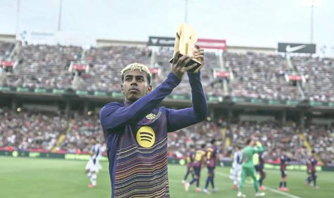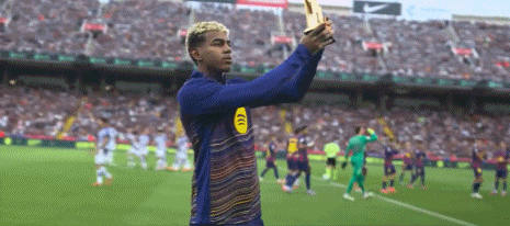 正如去年在与西班牙人队的德比战前所做的那样(那场比赛于2024年11月3日进行,邦马蒂也展示了她的金球奖,而莱万则展示了他的盖德-穆勒奖),亚马尔在草坪上向巴萨球迷展示了科帕奖。